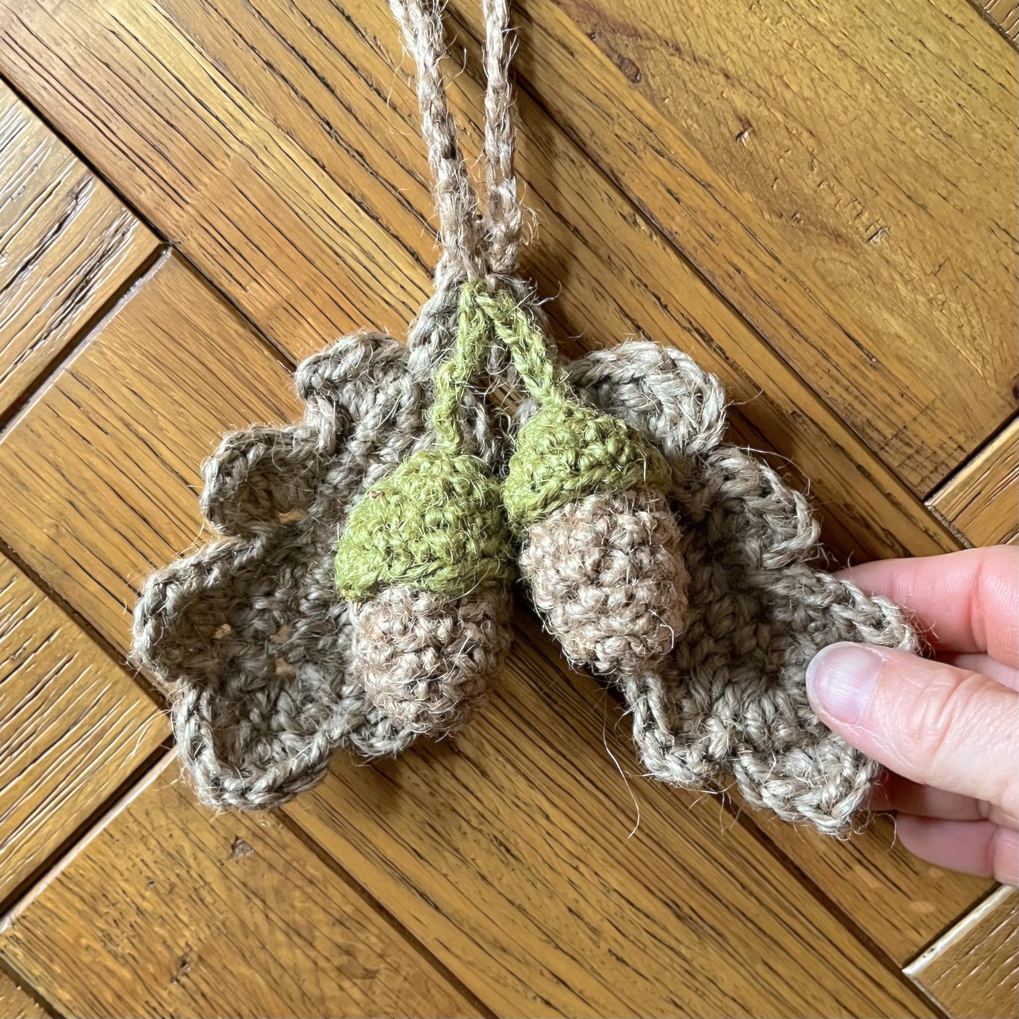 Handmade using 100% Jute on a natural wood ring. Decorated with 100% jute oak leaves and acorns.