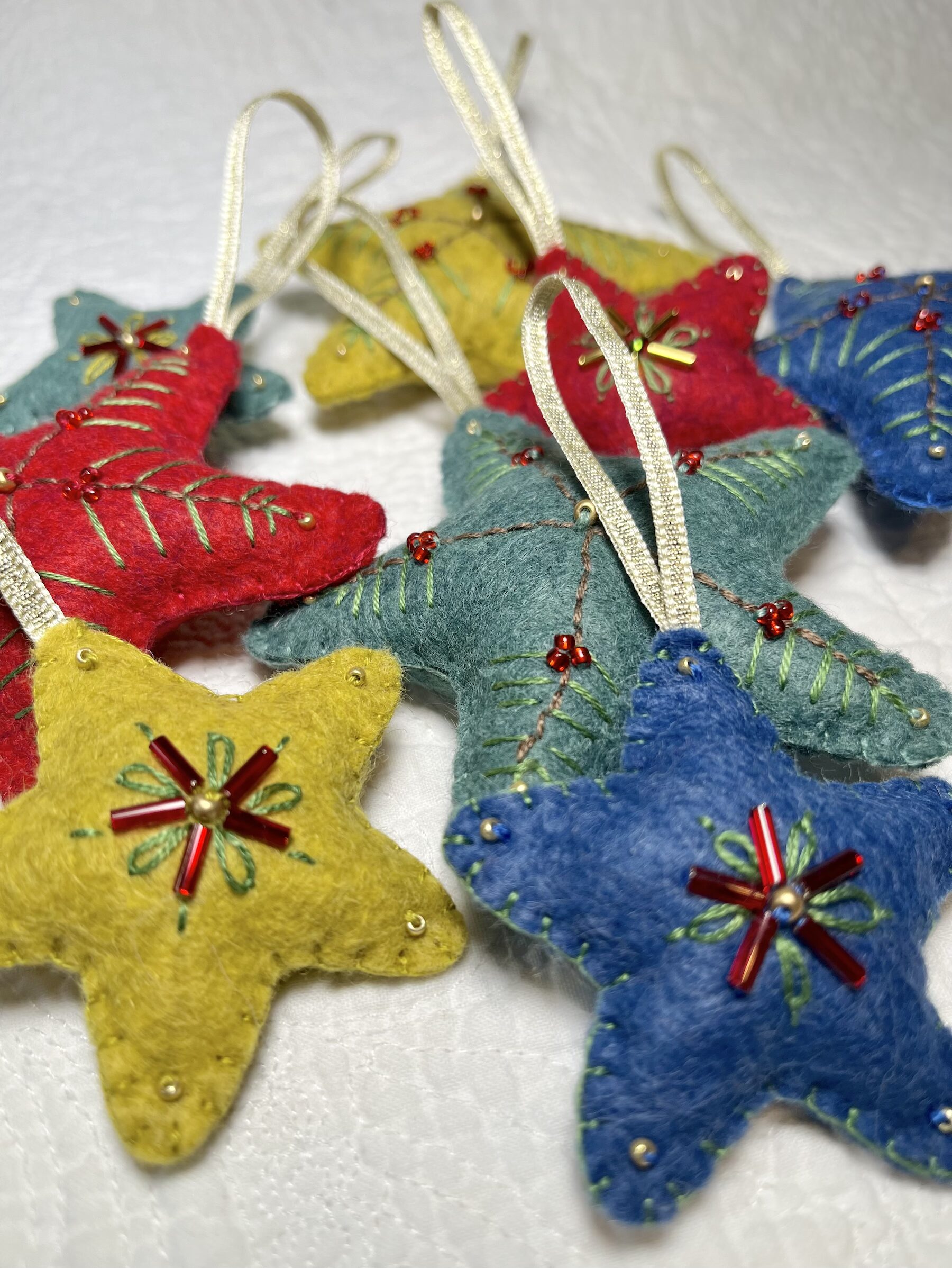 Handmade in felt and hand sewn and embellished with glass beads and a gold hanging ribbon.