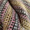 A loose fitting, double length infinity scarf made using a soft and lightweight acrylic/wool mix yarn in a combination of subtle soft shades of pink, grey, green.