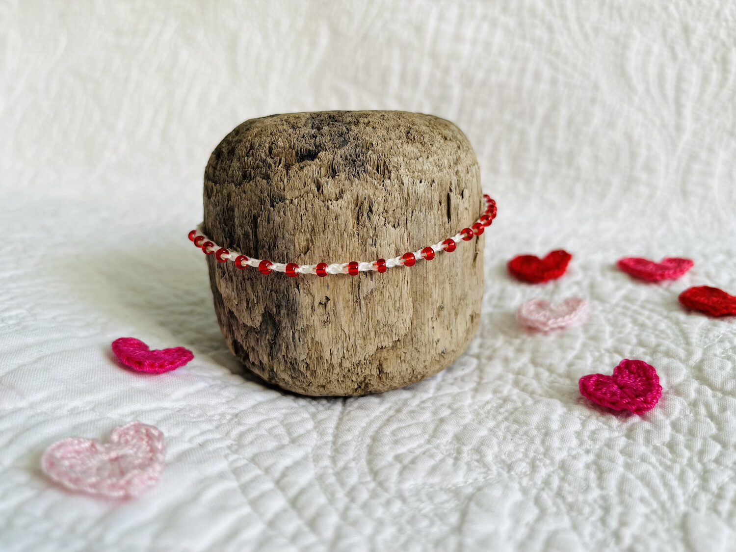 A handmade, crocheted, single stranded bracelet. Made using red glass beads and 100% cream cotton with a fully adjustable sliding bead fastening.